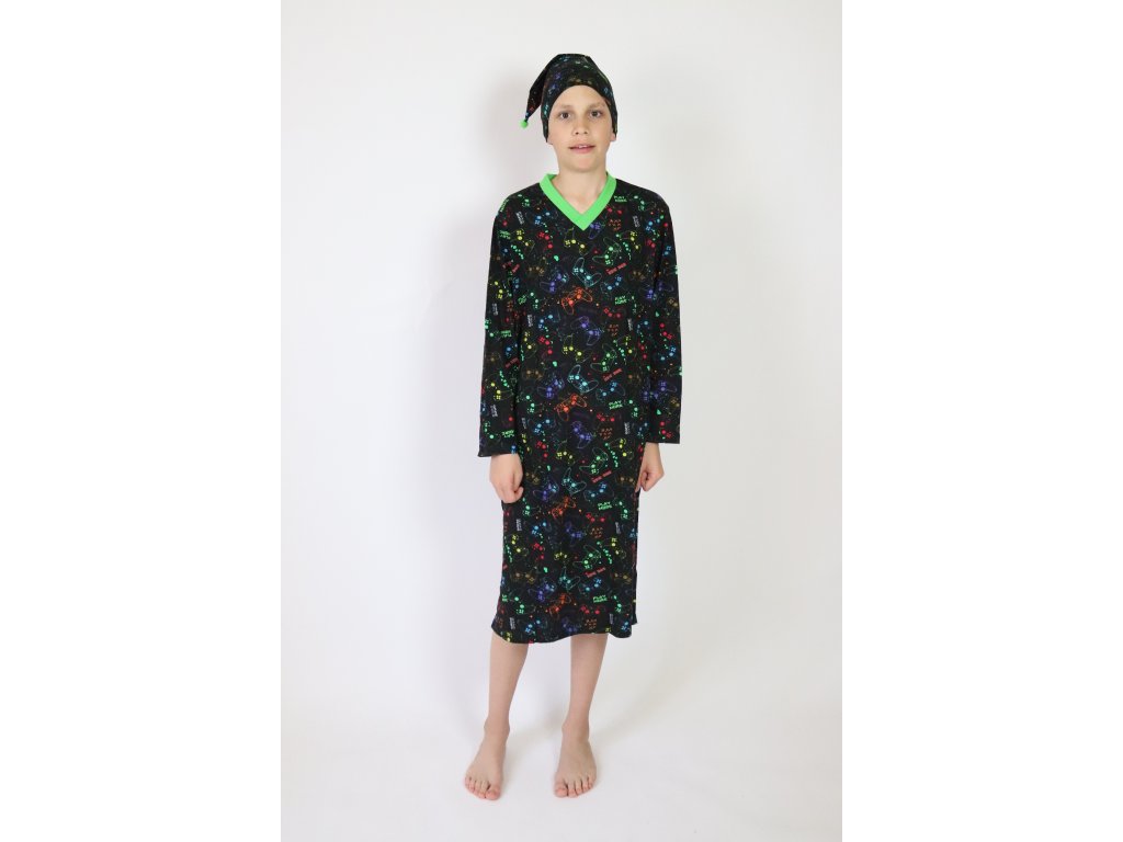 Výrobce: Rozárka| Chlapecká noční košile značky Rozárka v černé barvě. Noční košile má dlouhý rukáv a výstřih do V. Noční košile je s potiskem ovladačů playstation nápisem play more a game over potiskem. Noční košile je dodávána s čepičkou.