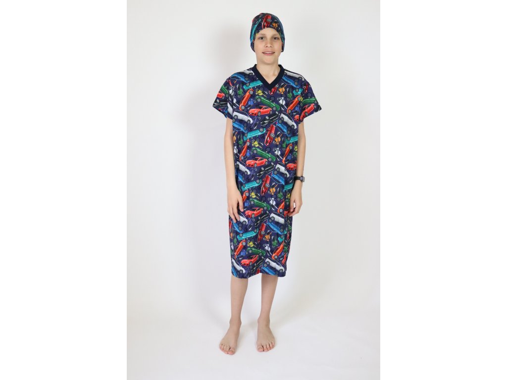 Výrobce: Rozárka| Chlapecká noční košile značky Rozárka v tmavě modré barvě. Noční košile má krátký rukáv a výstřih do V. Noční košile je zdobena obrázky aut a motorek. Ke košili je dodávána čepička s bambulkou.