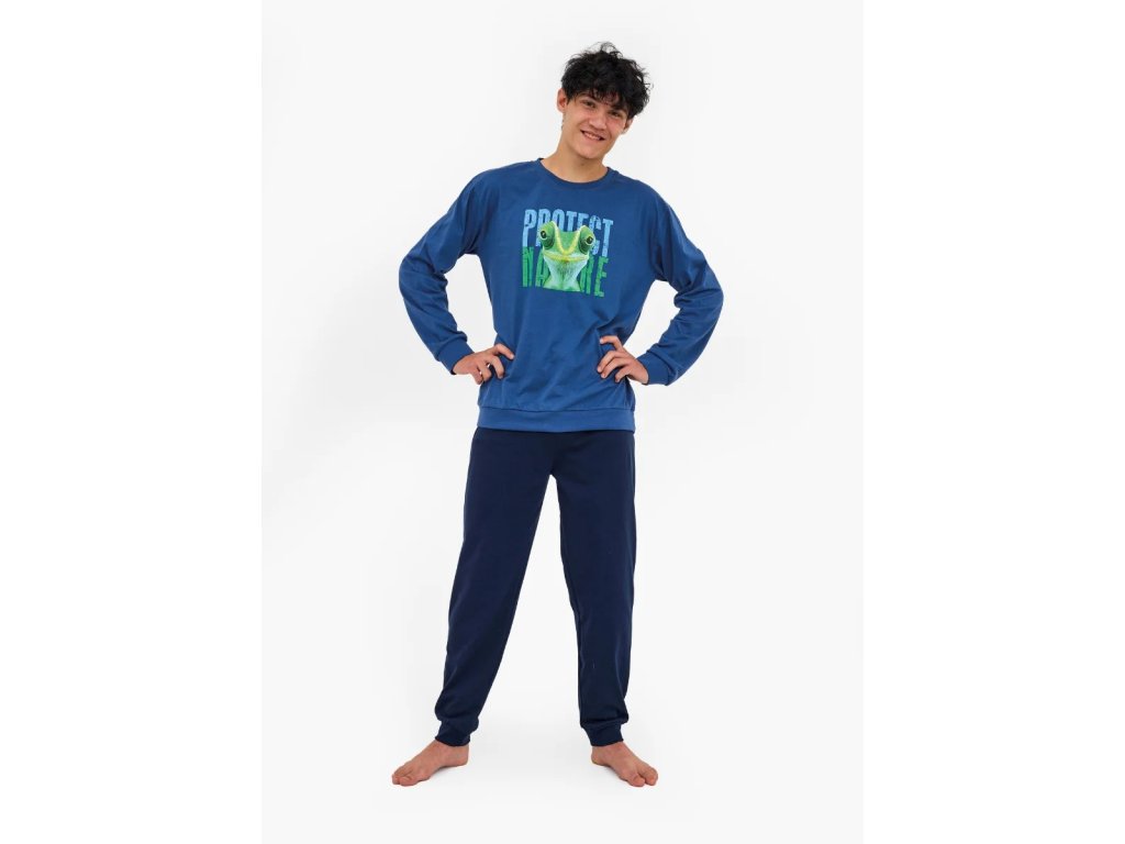 Výrobce: Cornette| Chlapecké pyžamo značky Cornette v tmavě modré barvě. Klučičí pyžamo má dlouhý rukáv a kulatý výstřih. Chlapecké dlouhé pyžamo v tmavě modré barvě má na tričku obrázek chameleona a nápis PROTECT NATURE. Kalhoty jsou jednobarevné tmavě modré. Triko i kalhoty jsou ukončeny do manžet. Klučičí pyžamo je z kolekce YOUNG BOY COLLECTION. Velmi pěkné provedení.