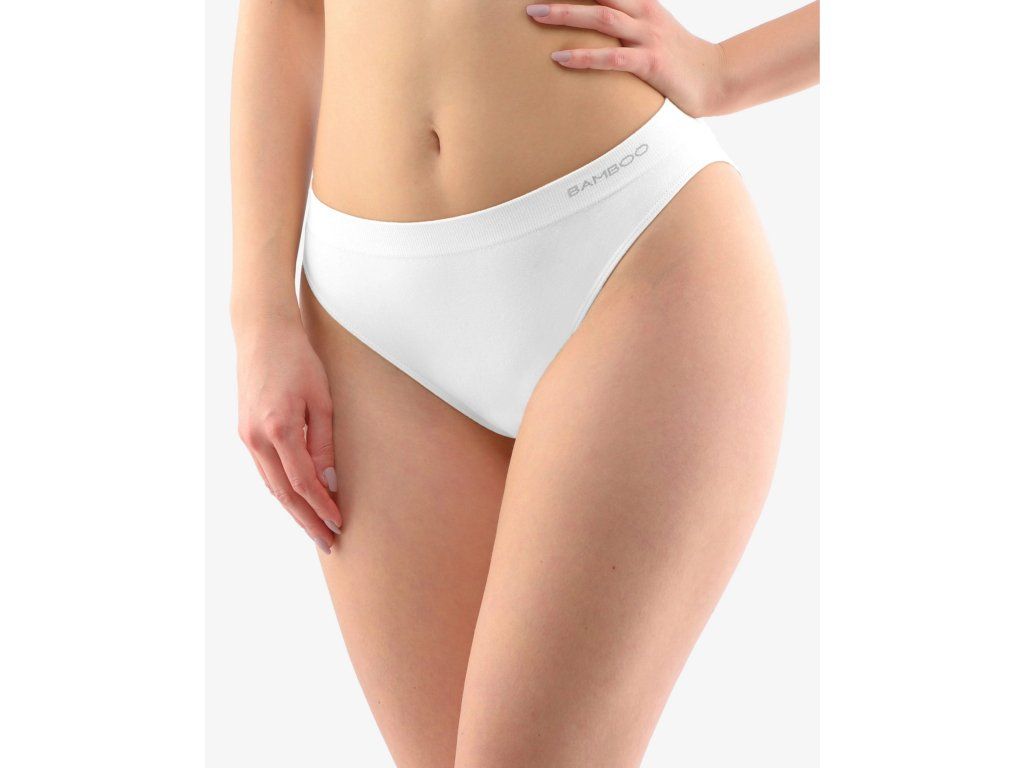 Výrobce: Gina| Dámské bambusové klasické bezešvé kalhotky značky Gina. Kalhotky jsou v bílé barvě. Dámské kalhotky mají v pase na gumě nápis BAMBOO. Kalhotky klasického střihu s úzkým bokem. Pasový kraj je zesílený a zapravený bezešvým způsobem. V nohavičkách je zašitá úzká pruženka. Kalhotky jsou jednobarevné. V záložce je vypletené logo.