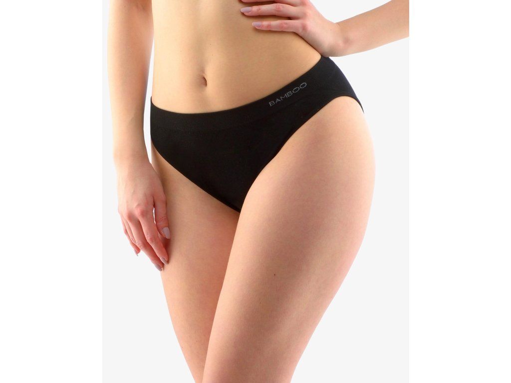 Výrobce: Gina| Dámské bambusové klasické bezešvé kalhotky značky Gina. Kalhotky jsou v černé barvě. Dámské kalhotky mají v pase na gumě nápis BAMBOO. Kalhotky klasického střihu s úzkým bokem. Pasový kraj je zesílený a zapravený bezešvým způsobem. V nohavičkách je zašitá úzká pruženka. Kalhotky jsou jednobarevné. V záložce je vypletené logo.