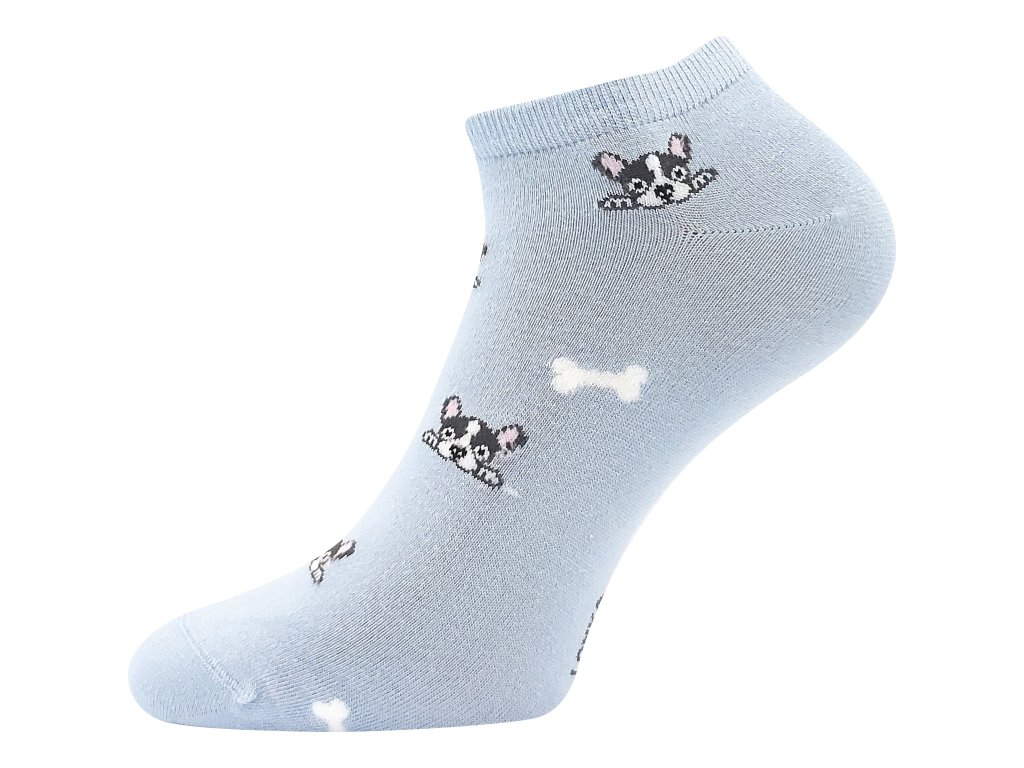 Výrobce: Boma| Dámské bambusové krátké ponožky Bibiana ve světle modré barvě. Ponožky jsou jednobarevné světle modré s obrázky pejsků. Špička ponožky je uzavřena náročnějším řetízkováním, díky kterému je spoj dokonale hladký a nehrozí, že ponožka bude tlačit.