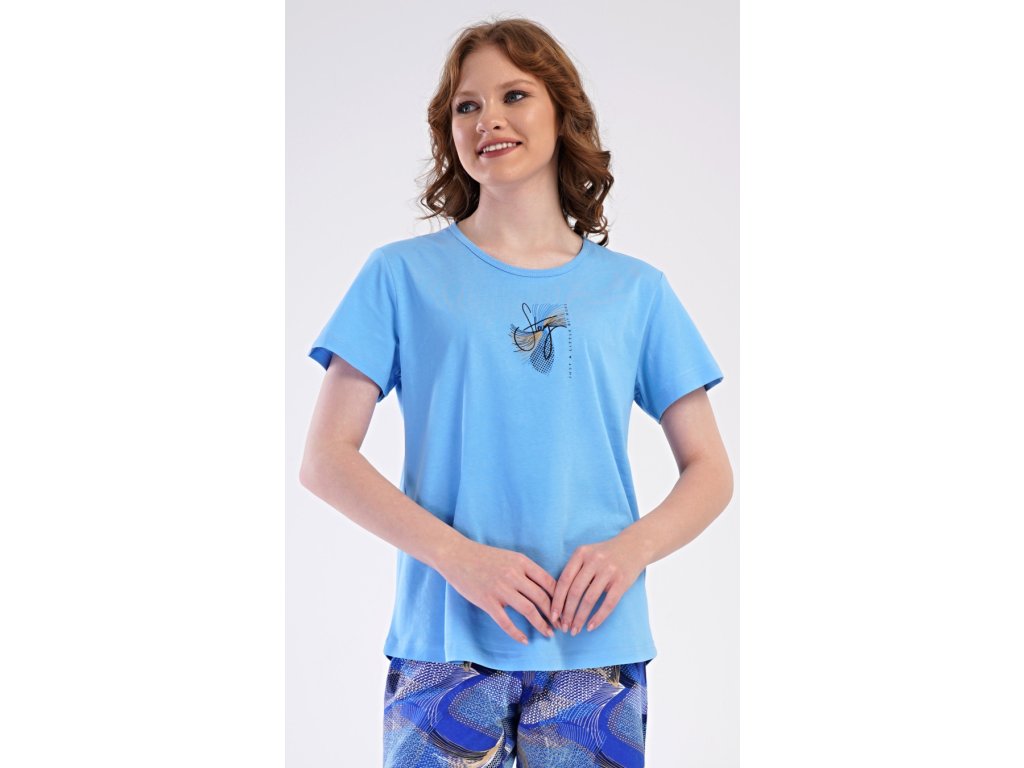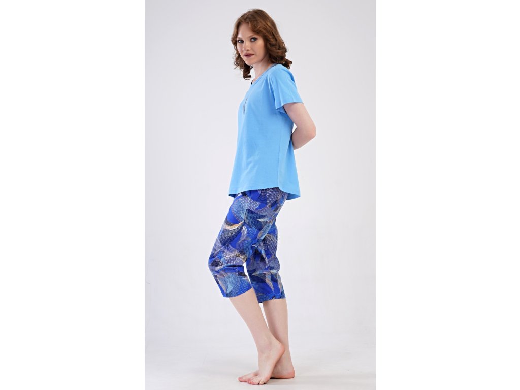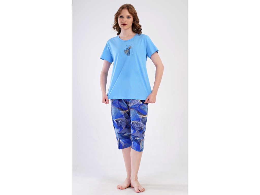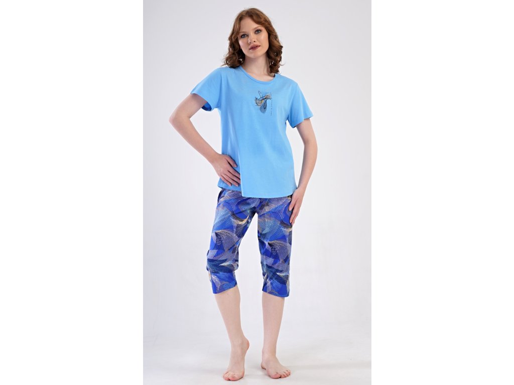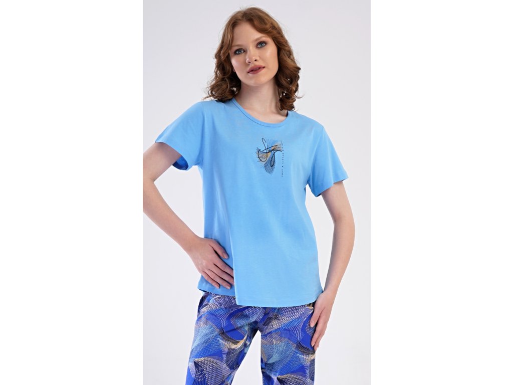 Výrobce: Vienetta Secret| Dámské bavlněné kapri pyžamo Eliza. Dámské capri pyžamo se skládá z trička s krátkým rukávem a capri kalhot. Tričko s kulatým výstřihem má na hrudi obrázek s geometrickým vzorem, který je i na kalhotách, které mají v pase gumu a šňůrku na stažení. Použitý bavlněný materiál je příjemný a poddajný na dotek.