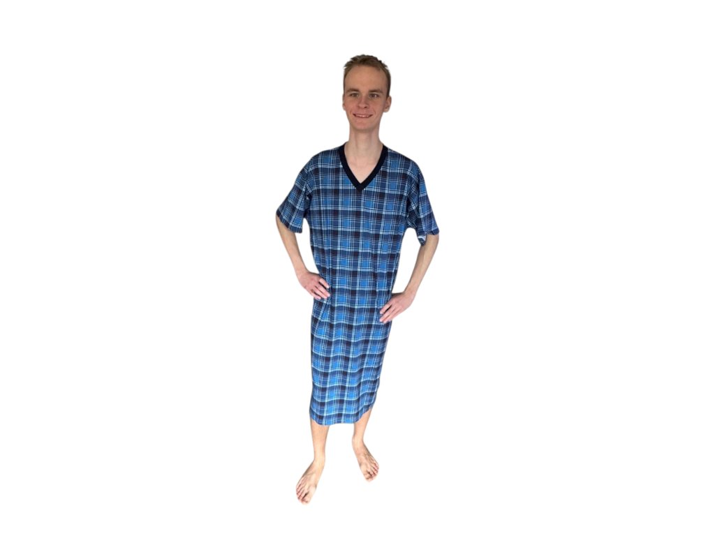 Výrobce: Rozárka| Pánská noční košile značky Rozárka v modré barvě. Noční košile má výstřih do V a krátký rukáv. Noční košile má kostkovaný vzor. Noční košile má digitální tisk. Velmi příjemný materiál.