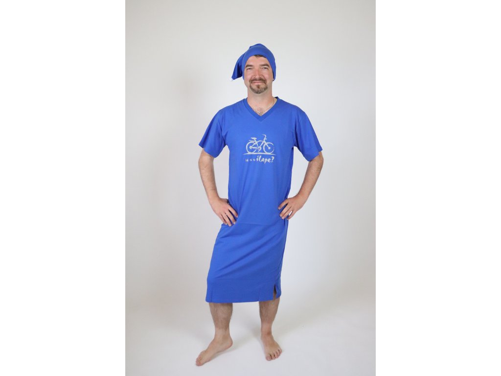 Výrobce: Rozárka| Chlapecká noční košile značky Rozárka v modré barvě. Noční košile má krátký rukáv a výstřih do V. Noční košile je zdobena obrázkem kola a nápisem "Jak ti to šlape"? Ke košili je dodávána čepička s bambulkou. V prodeji také v pánském provedení košile se stejným motivem.