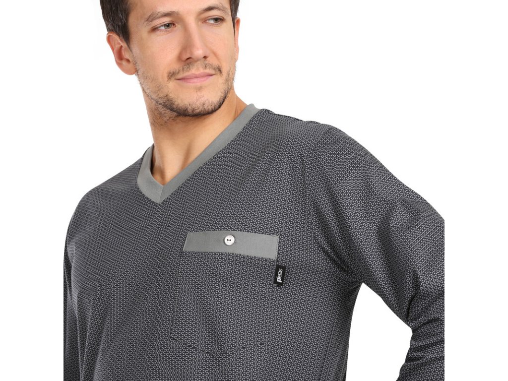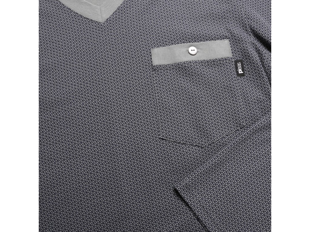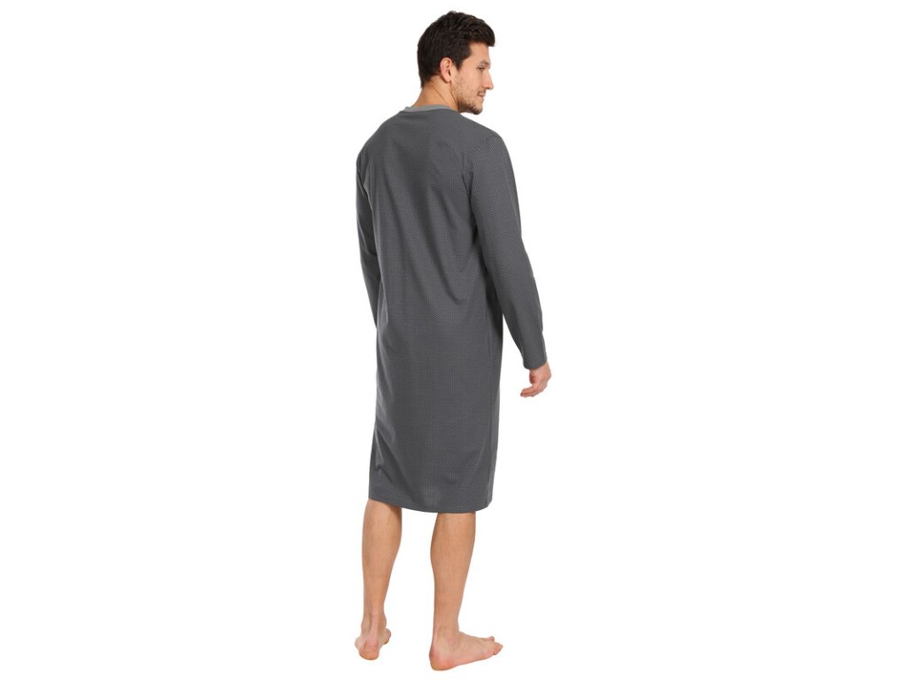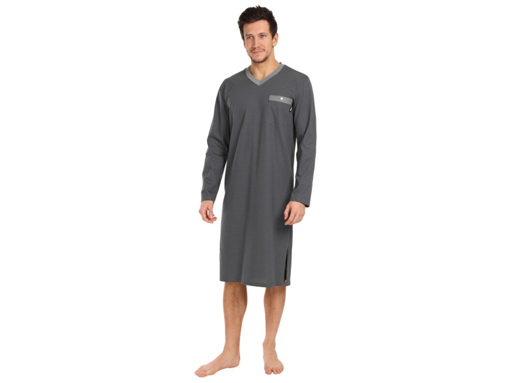 Výrobce: Pleas| Pánská bavlněná noční košile s dlouhým rukávem od firmy Pleas. Pánská noční košile je v šedé barvě výrobcem označována jako smaragdová zeleň s drobným vzorem. Pánská noční košile má výstřih do V a má kapsičku.