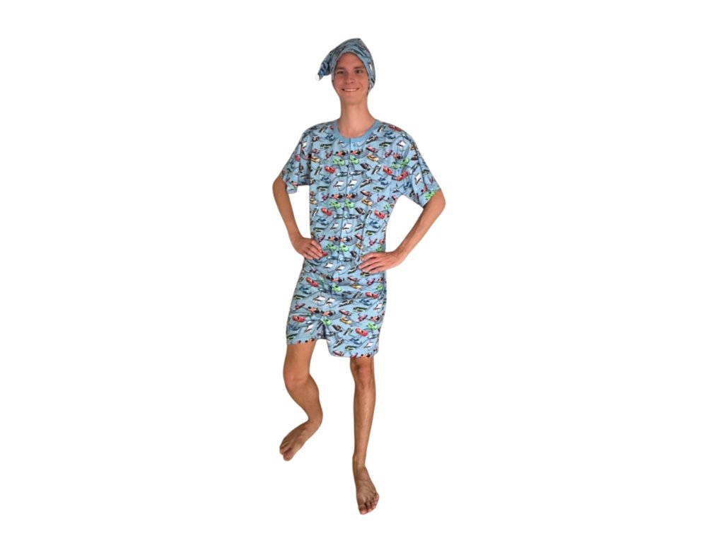 Výrobce: Rozárka| Pánský overal na spaní značky Rozárka s čepičkou v modré barvě s obrázky aut. Overal má krátký rukáv, krátké nohavice, kulatý výstřih a rozepínání na knoflíky. Je zdoben celopotiskem s auty. K overalu je dodávána čepička s bambulkou.