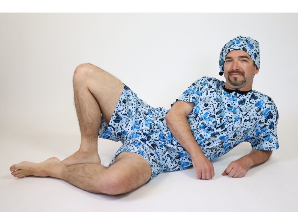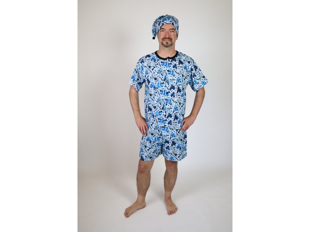 Výrobce: Rozárka| Pánský overal na spaní značky Rozárka s čepičkou ve světle modré barvě s celopotiskem, kde je Vespa. Overal má krátký rukáv, krátké nohavice, kulatý výstřih a rozepínání na knoflíky. K overalu je dodávána čepička s bambulkou.