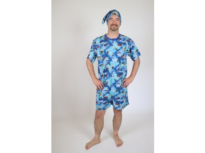 Výrobce: Rozárka| Pánský overal na spaní značky Rozárka s čepičkou ve světle modré barvě s celopotiskem, kde je Vespa. Overal má krátký rukáv, krátké nohavice, kulatý výstřih a rozepínání na knoflíky. K overalu je dodávána čepička s bambulkou.