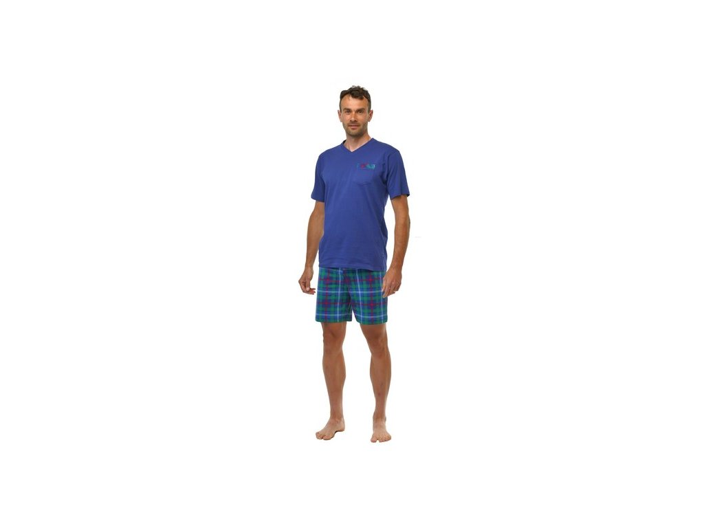 Výrobce: Calvi| Pánské bavlněné pyžamo s krátkým rukávem od firmy Calvi. Vrchní díl pyžama je v tmavě modré barvě a má na pravé straně kapsičku. Tričko má výstřih do V. Kalhoty jsou kostkované modrozelené.