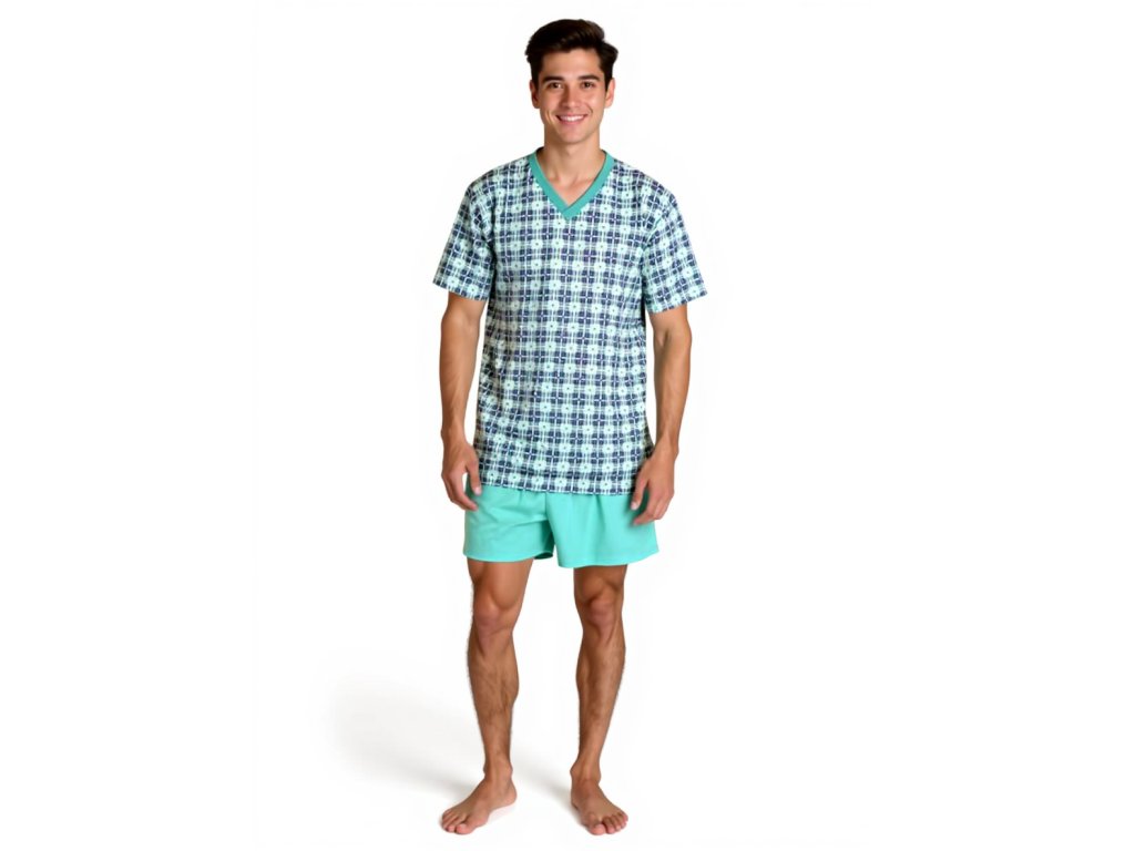 Výrobce: Rozárka| Pánské krátké pyžamo značky Rozárka v mintové barvě. Tričko pyžama má krátký rukáv a výstřih do V. Tričko pyžama má kostkovaný vzor a kraťasy jsou jednobarevné v mintové barvě.
