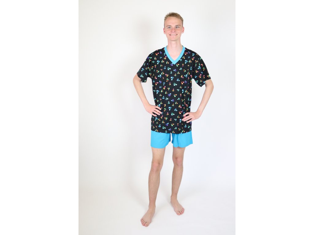 Výrobce: Rozárka| Pánské krátké pyžamo značky Rozárka v černé barvě. Tričko pyžama má krátký rukáv a výstřih do V. Na triku jsou obrázky barevných šipek. Pyžamo má tyrkysové lemování a tyrkysové kalhoty.
