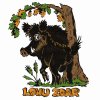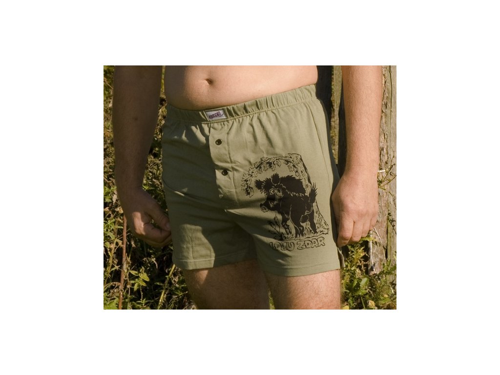 Výrobce: Rozárka| Pánské trenkoslipy značky Rozárka v tmavě zelené barvě. Trenky mají klasický střih, rozparky po stranách a dva knoflíčky na předním díle. Na levé nohavici je obrázek divočáka s nápisem "LOVU ZDAR". Obrázek je v černé barvě.
