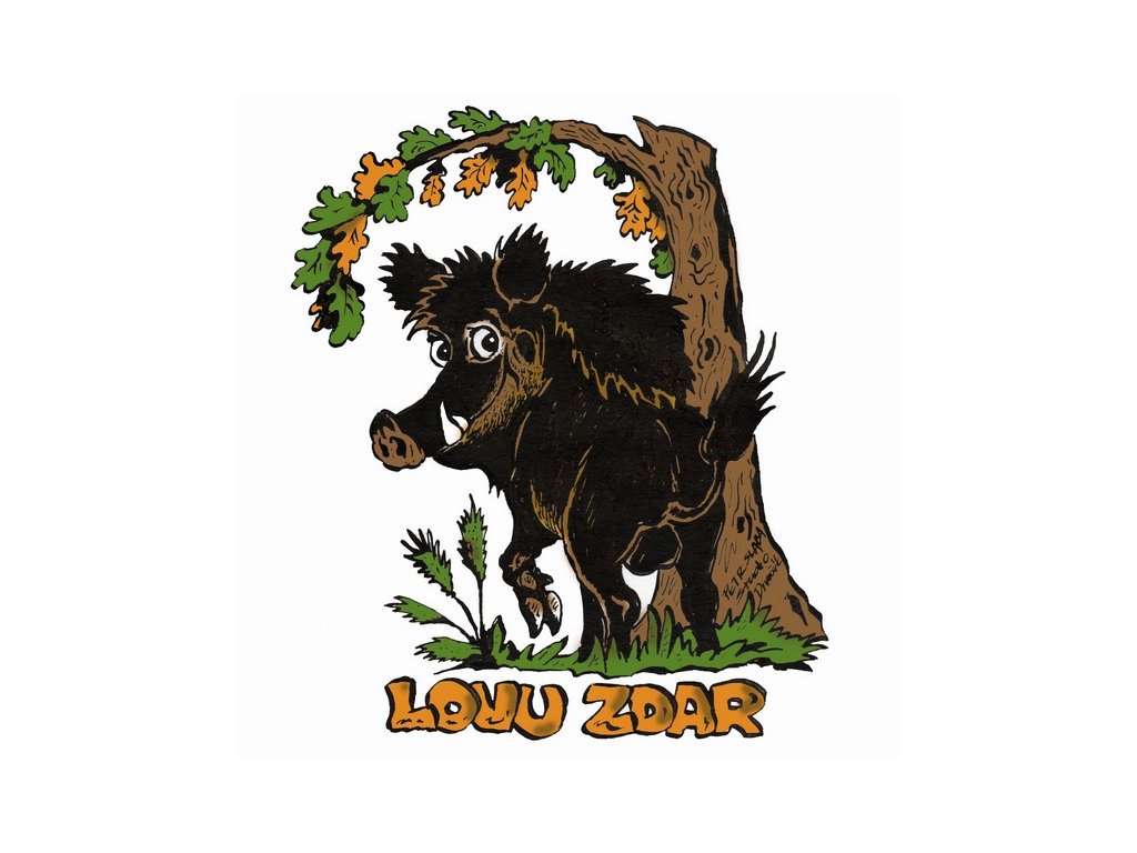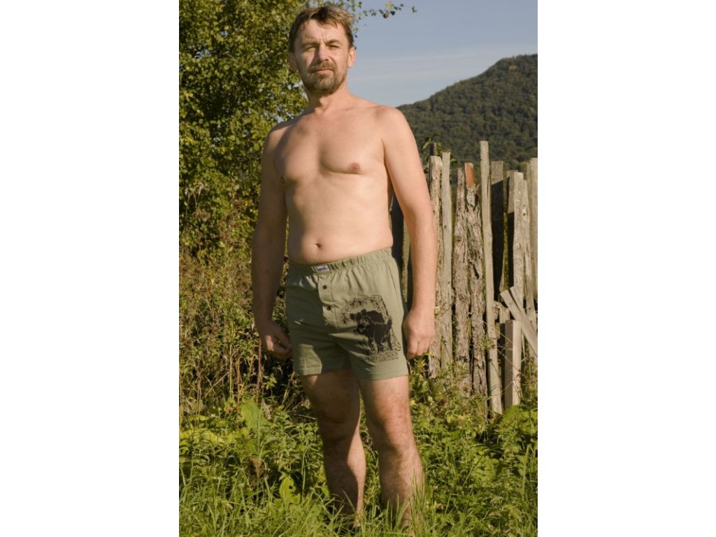 Výrobce: Rozárka| Pánské trenkoslipy značky Rozárka v tmavě zelené barvě. Trenky mají klasický střih, rozparky po stranách a dva knoflíčky na předním díle. Na levé nohavici je obrázek divočáka s nápisem "LOVU ZDAR". Obrázek je v černé barvě.