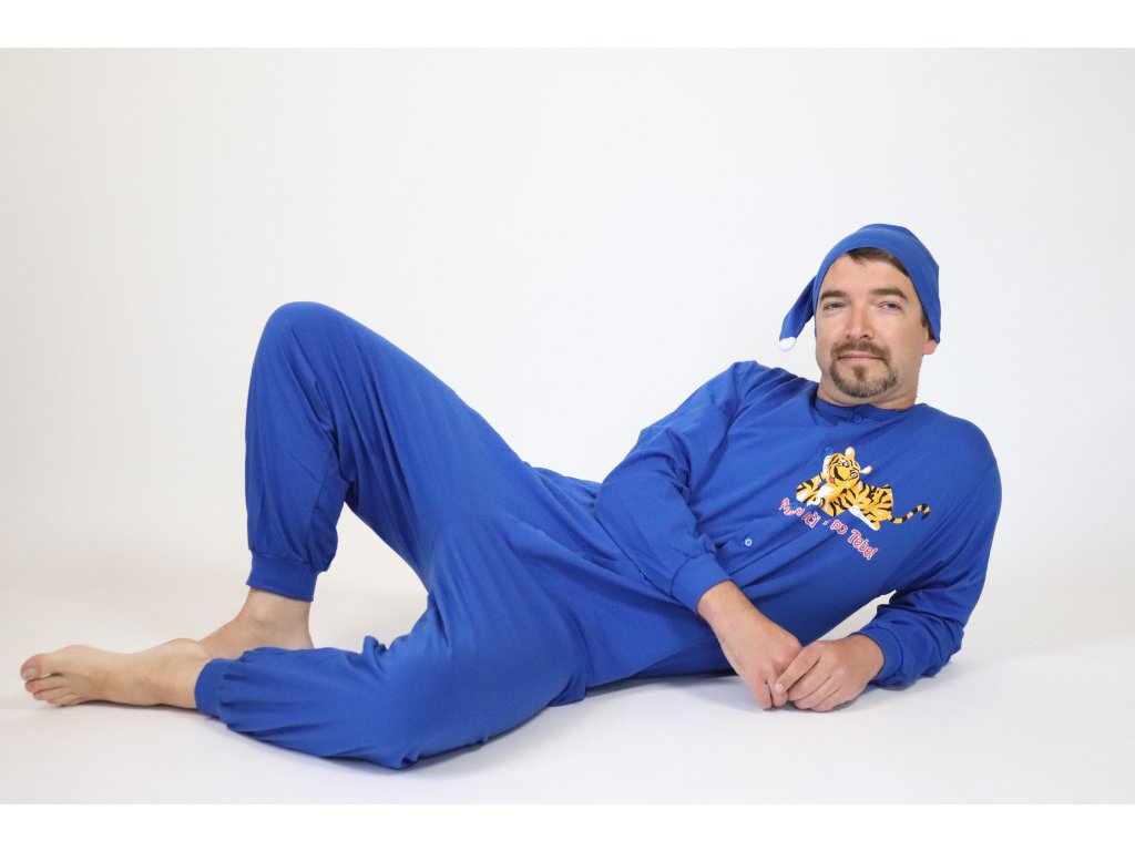 Výrobce: Rozárka| Pánský overal na spaní s čepičkou značky Rozárka v modré barvě. Overal má dlouhý rukáv, dlouhé nohavice, kulatý výstřih a rozepínání na knoflíky. Na overalu je obrázek Tygra a nápis Mám oči jen pro tebe. K overalu je dodávána čepička s bambulkou.
