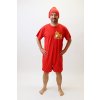 Výrobce: Rozárka| Overal na spaní s čepičkou značky Rozárka v červené barvě. Overal má krátký rukáv, krátké nohavice, kulatý výstřih a rozepínání na knoflíky. Na overalu je obrázek tygra a nápis Mám oči jen pro tebe. K overalu je dodávána čepička s bambulkou.