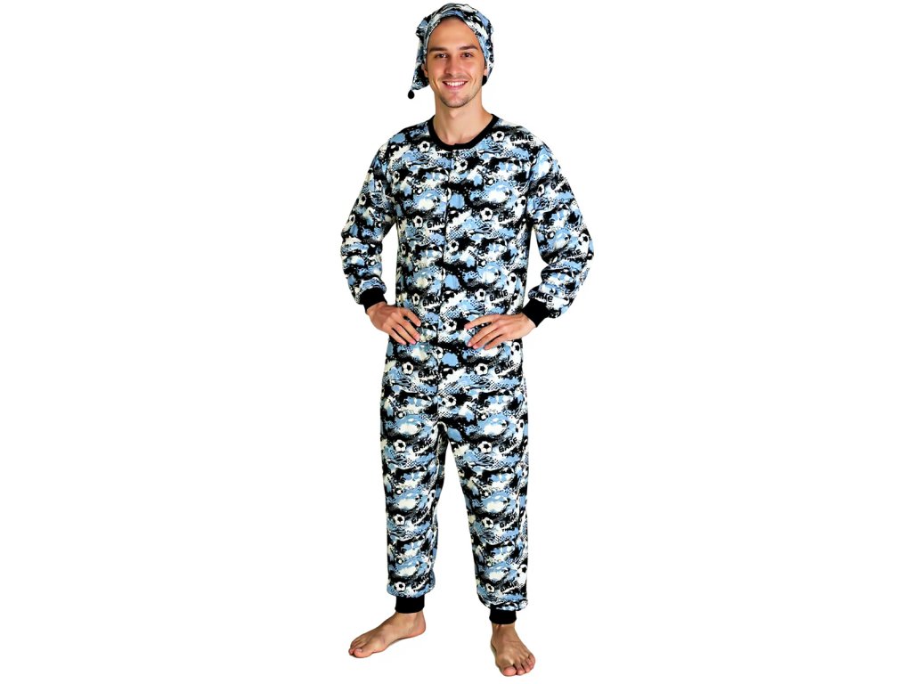 Pánský overal na spaní s čepičkou dlouhý Rozárka P61 fotbal modrý