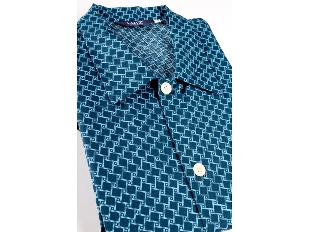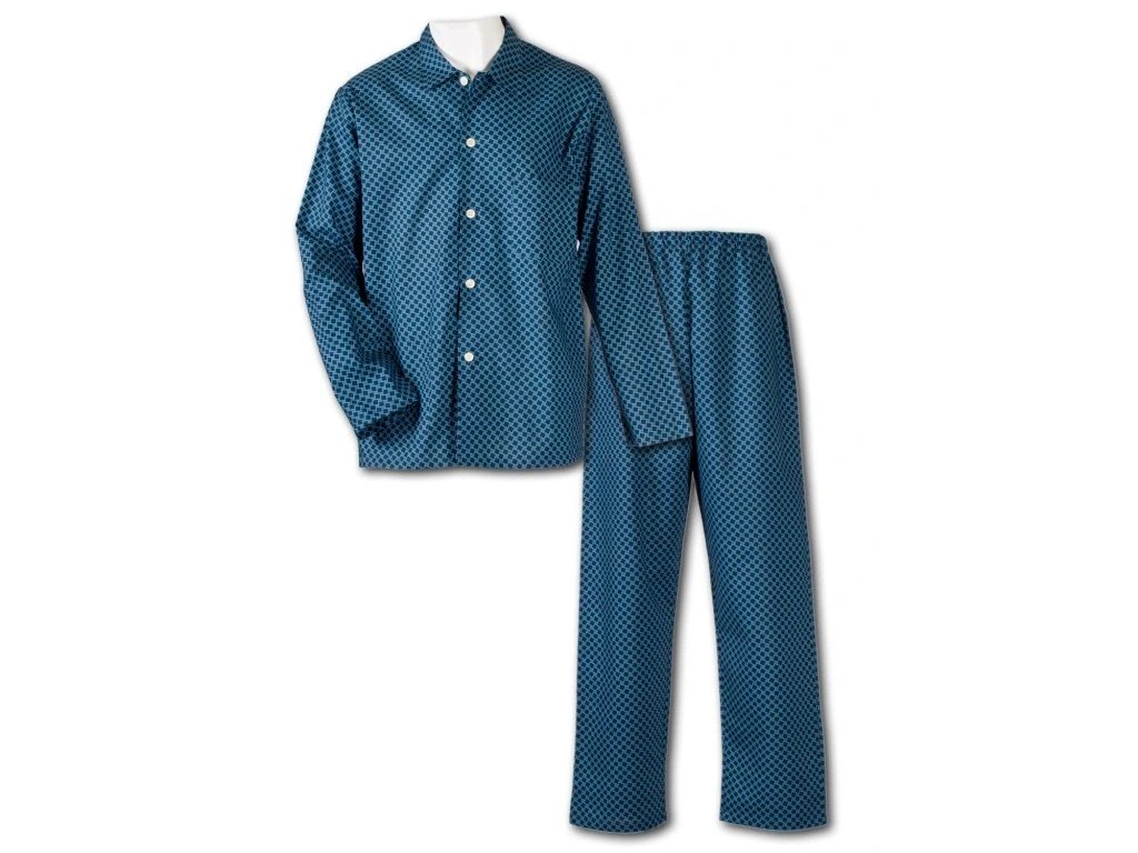 Pánské klasické pyžamo Karel na propínání. Pánské pyžamo je s dlouhým rukávem i nohavicí. Kabátek pyžama je propínací a má kapsy. Pyžamové kalhoty jsou do gumy. Pyžamo je v modrozelené barvě a má drobný vzor. Pyžamo je vyrobeno z 100% bavlny. Pyžamo je pro muže, kteří dávají přednost jedinečnosti, ocení kvalitní zpracování a jdou cestou vlastního stylu. Vyzkoušejte kvalitu, kterou si oblíbíte.