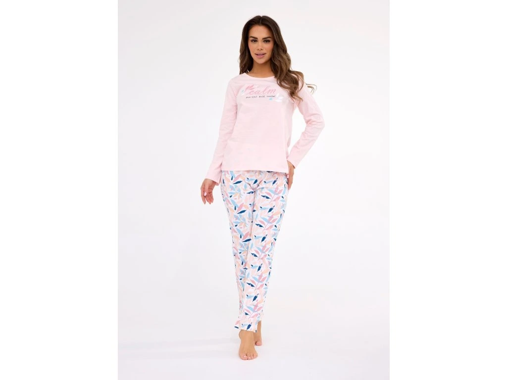 Výrobce: Cornette| Dámské dlouhé pyžamo značky Cornette v růžové barvě. Dámské pyžamo má triko s dlouhým rukávem a nápisem Calm (klid). Kalhoty mají květinový vzor. Velmi elegantní provedení.