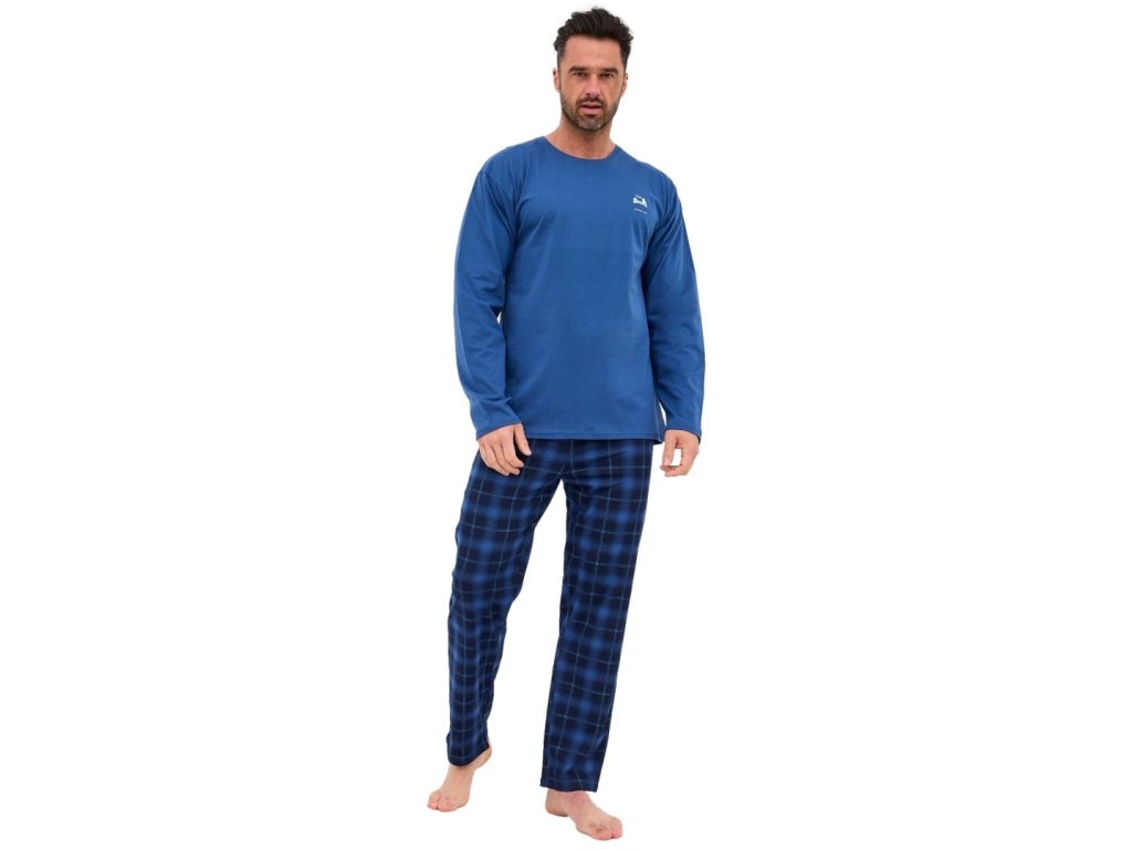 Výrobce: Cornette| Pánské pyžamo značky Cornette v tmavě modré barvě. Pánské pyžamo má triko s kulatým výstřihem a malým obrázkem na přední části. Kalhoty jsou kostkované rovné. Kalhoty jsou kostkované v tmavší modré barvě.