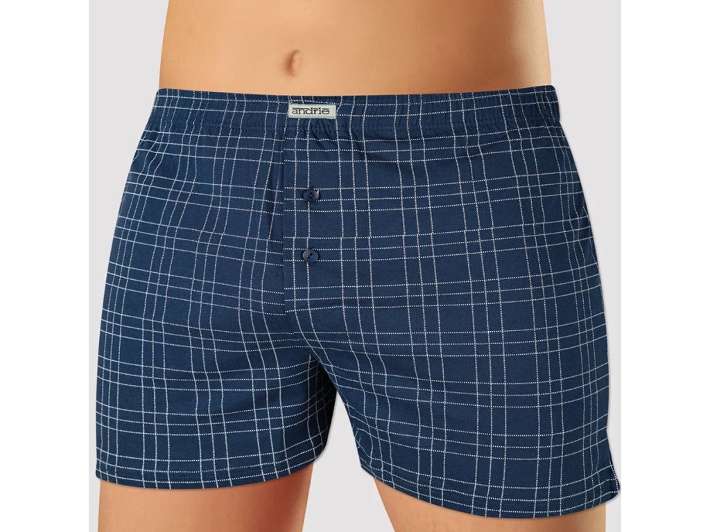 Výrobce: Andrie| Pánské trenkoslipy značky Andrie vzor PS 5914 v tmavě modré barvě. Trenky mají klasický střih se dvěma knoflíčky a po stranách rozparky. Trenkoslipy jsou v tmavě modré barvě a mají bílý kostkovaný vzor.