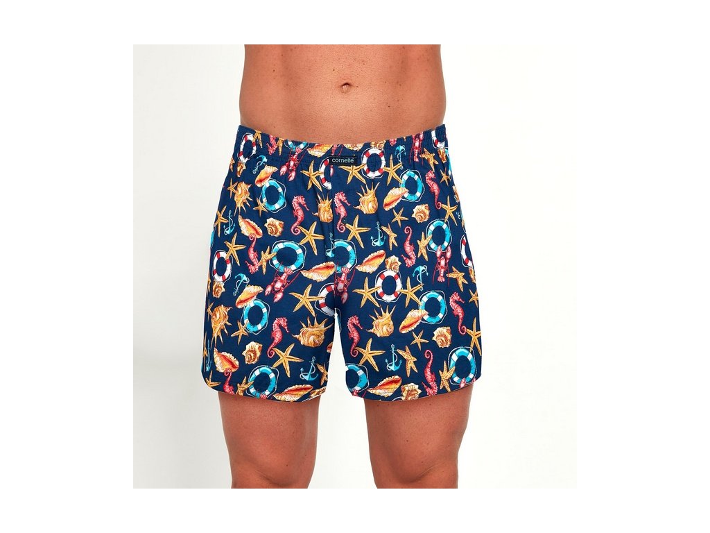 Výrobce: Cornette| Pánské plavky značky Cornette v modré barvě. Plavky jsou boxerkového střihu. Plavky jsou modré a po stranách mají barevné pruhy.